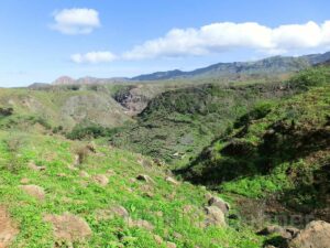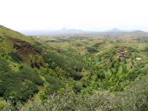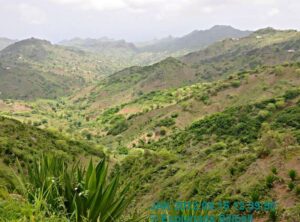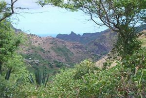 Hier findet der Wanderer meist Höhenwege. Entweder hinab zur Ostküste mit weiten Blicken in die landwirtschaftlich genutzten Täler der Ribeira de Principal, der Ribeira de Sao Miguel oder der Ribeira dos Flamengos. Bei klarem Wetter sieht man nicht nur im Osten Maio vor sich liegen, sogar den Pico und die Caldeira von Fogo kann man klar erkennen. W507 | W509