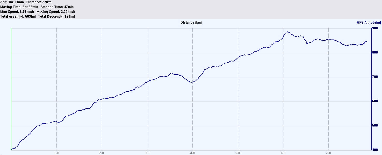 Höhen/Dauer: Aufstieg: +563m / Abstieg: -120m / Länge: 8km / Dauer: 2,5 – 3 Stunden