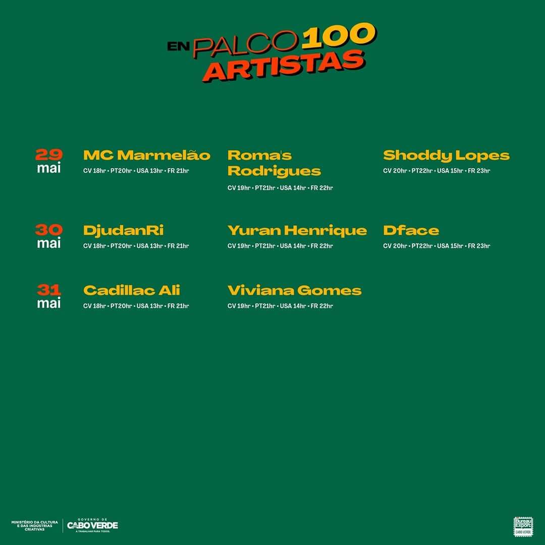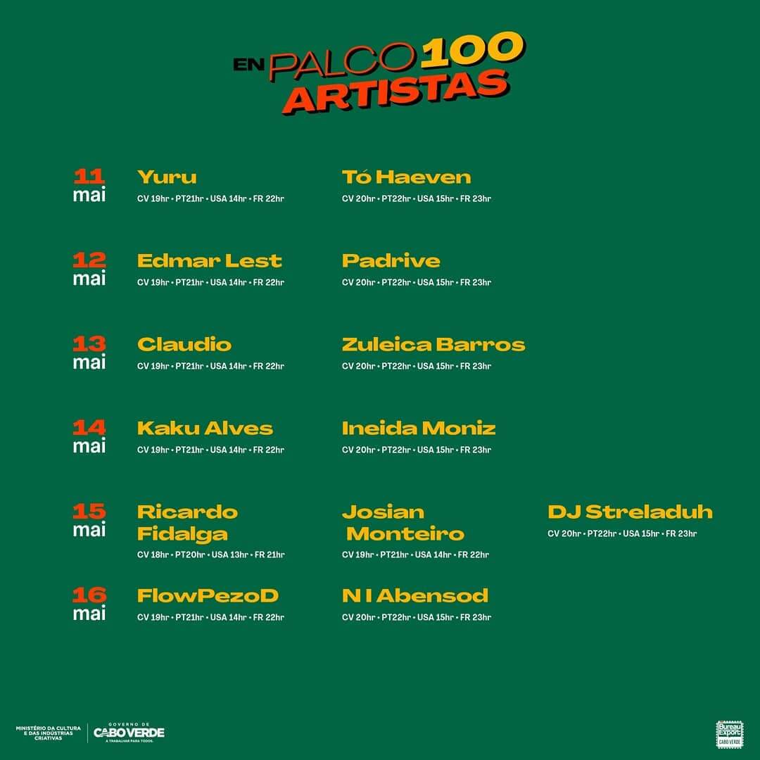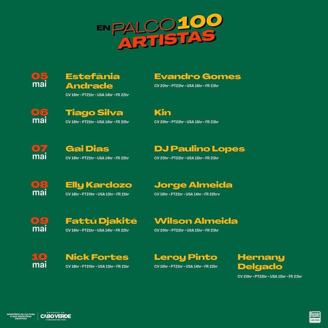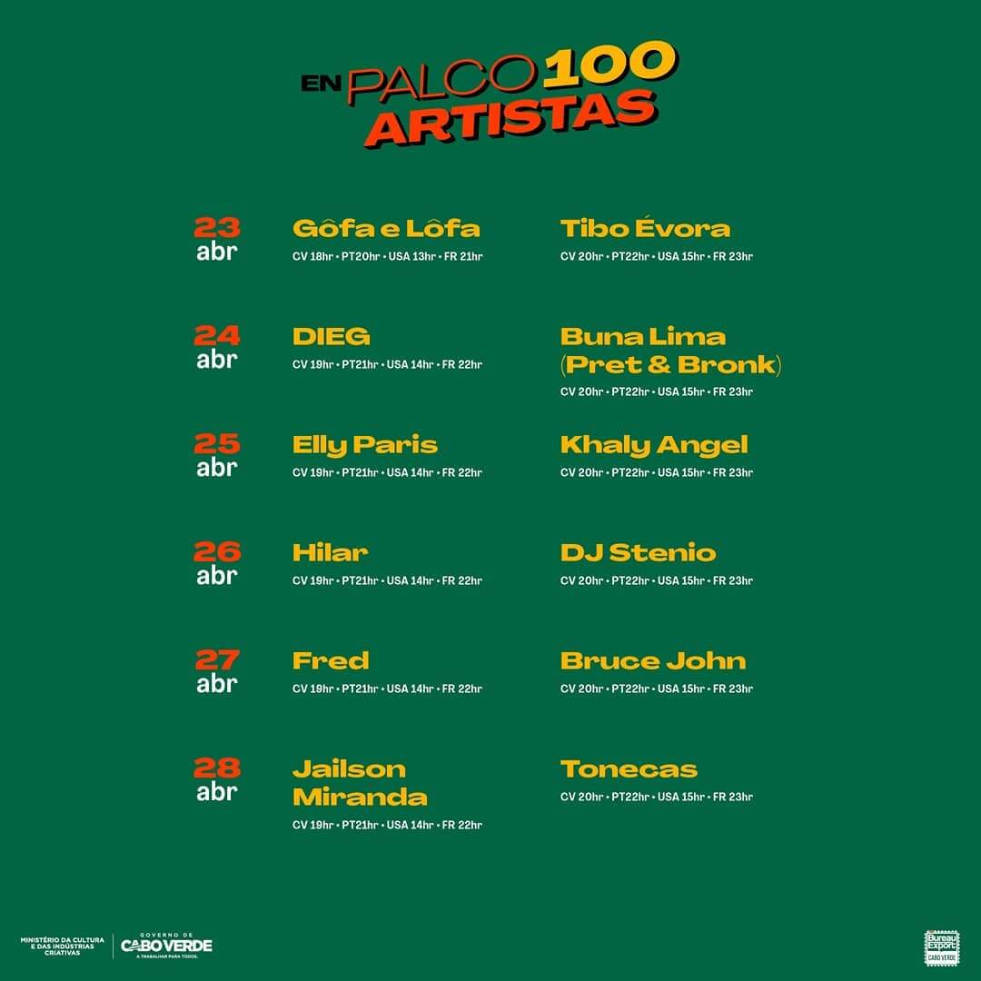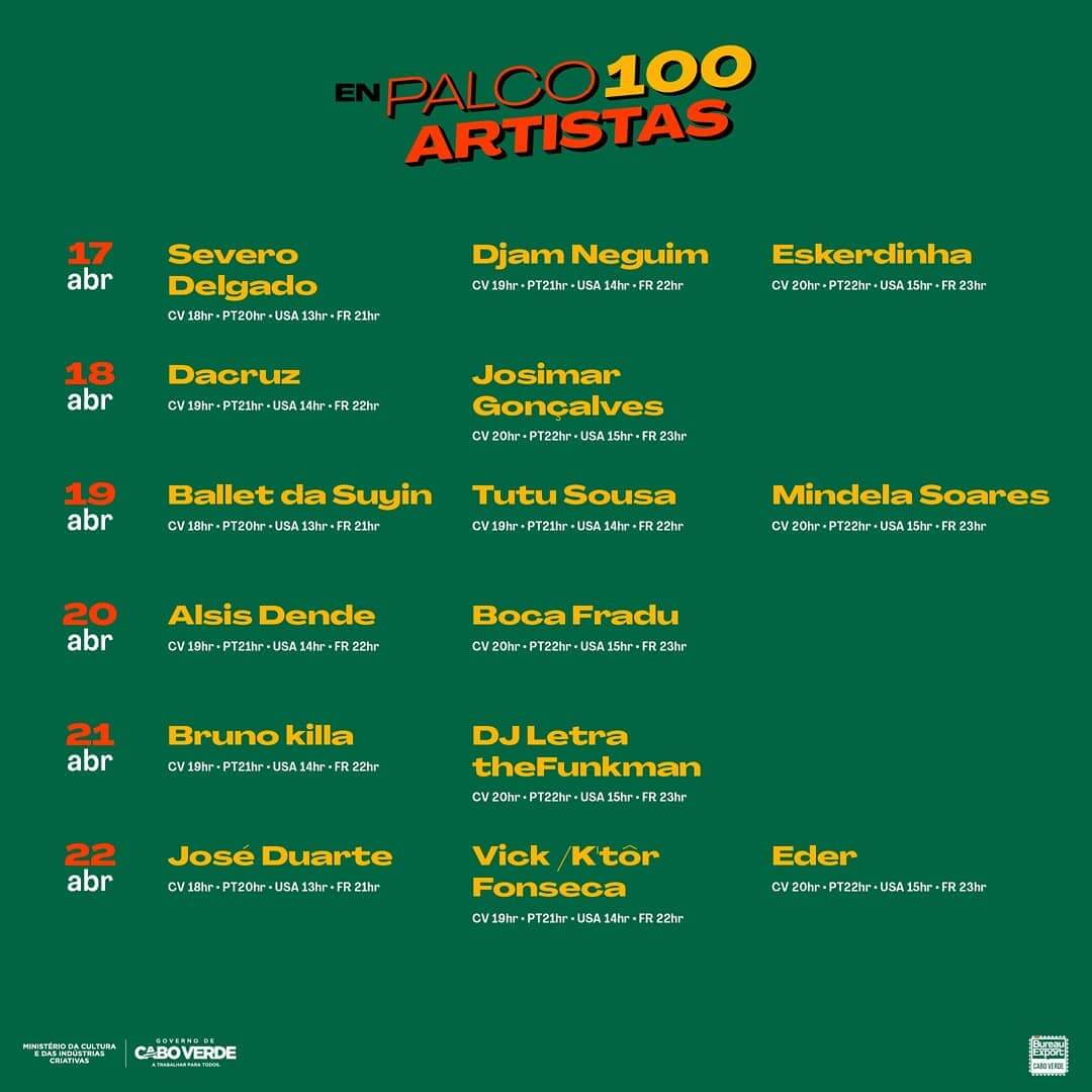 Das Programm “EnPalco100Artistas” begann am 17. April. Die Aufführungen und Darbietungen finden im Rahmen des Programms des Ministeriums für Kultur und Kreativwirtschaft über das Bureau Exports Music Cabo Verde (BEM-CV) statt.