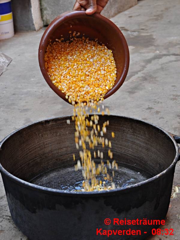 Katxupa, der Mais-Bohneneintopf gilt als das Nationalgericht vor allem der ländlichen Bevölkerung. Mais und Bohnen baut jeder Kapverder auf seinen Felder an.