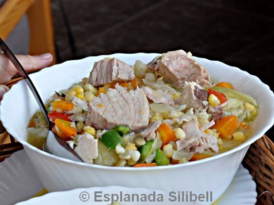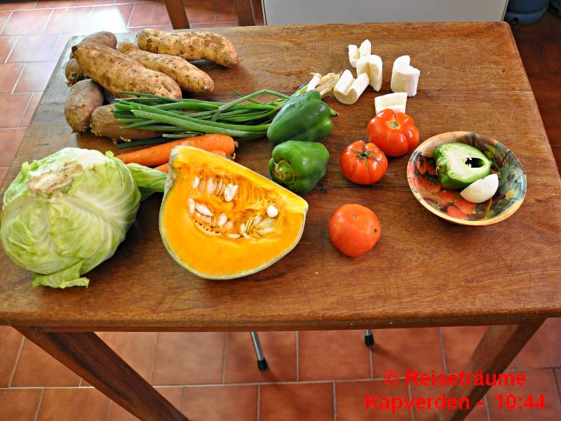 Die Katxupa Rica a la Esplanda Silibell ist eine vegetarische Katxupa, aber nicht vegan, da sie mit Fischeinlage, meist Filetstücke vom Serra-Fisch oder auch mal etwas Thunfisch gekocht wird. Für kapverdische Verhältnisse verwenden wir reichlich einheimsches Gemüse wie Karotten, Kürbis und/oder Kraut.