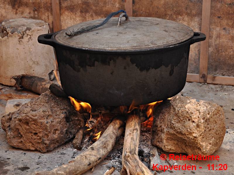 Eine Katxupa zu kochen ist energieintensiv. Darum wird der kapverdische Mais-Bohneneintopf nur auf dem Holzfeuer gekocht. Der leichte Rauchgeruch gibt einer Katxupa erst ihre spezielle Note.